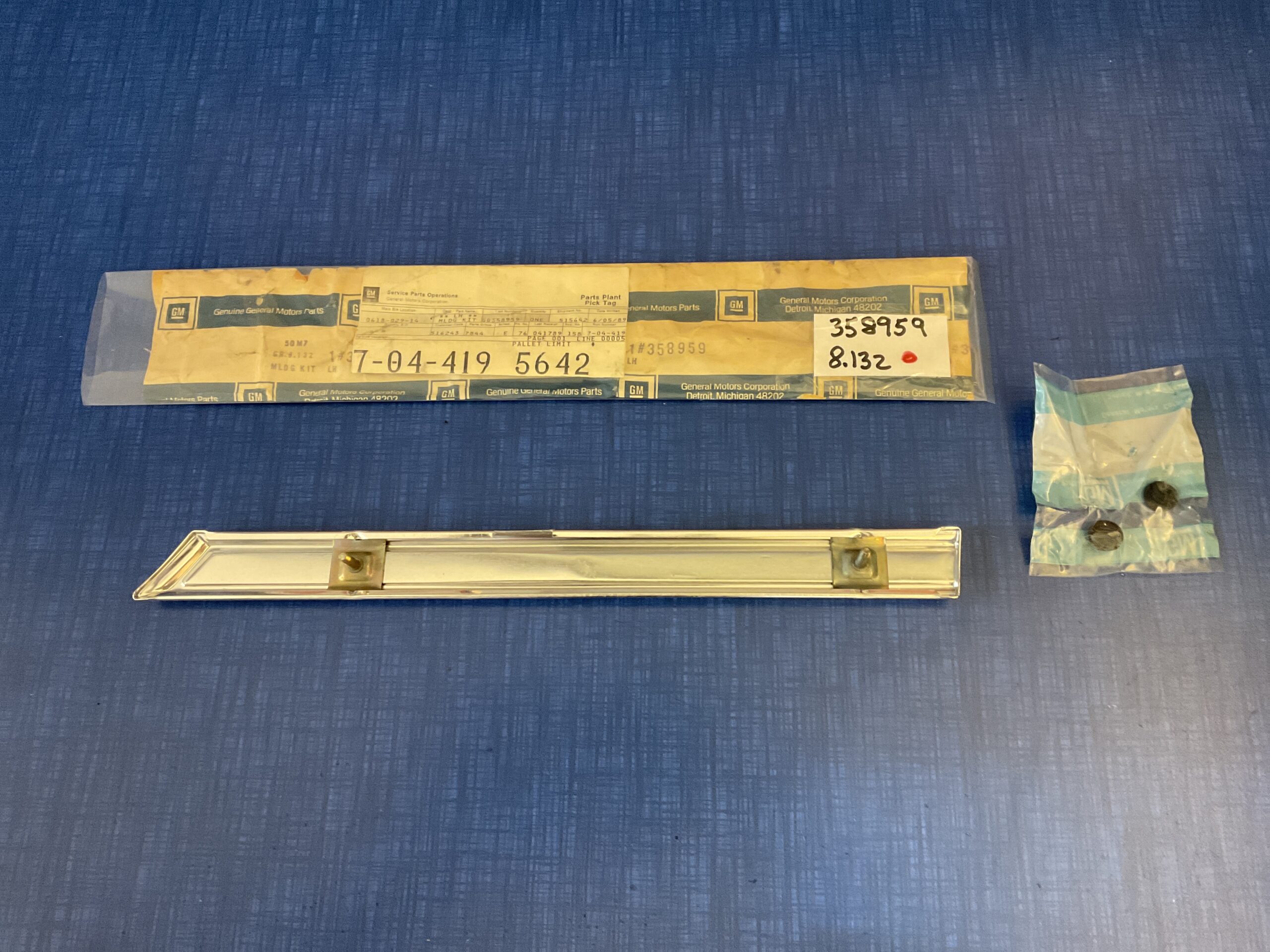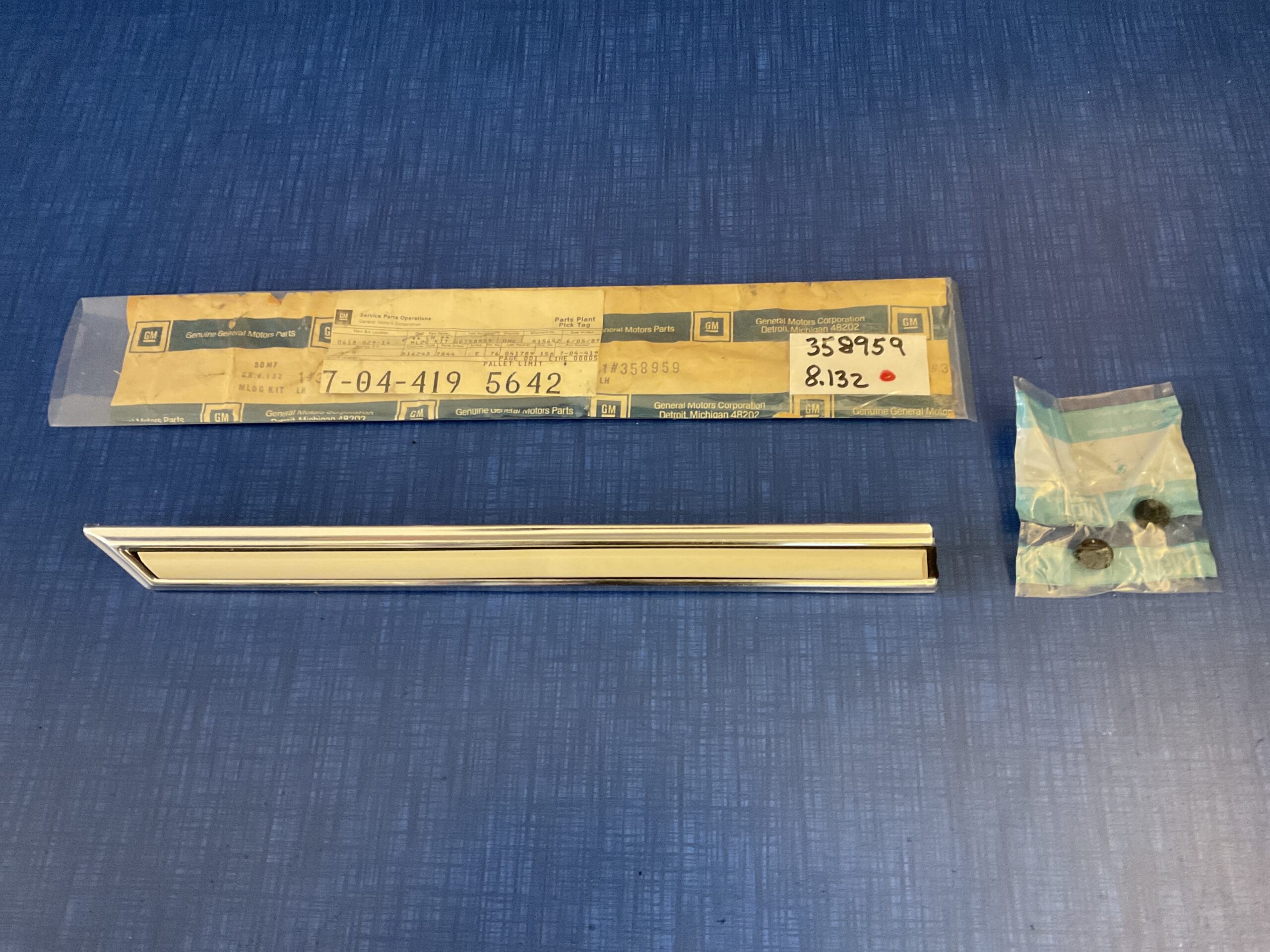 This new old stock left hand front fender side rear molding (White) was manufactured by General Motors for use on the following models: