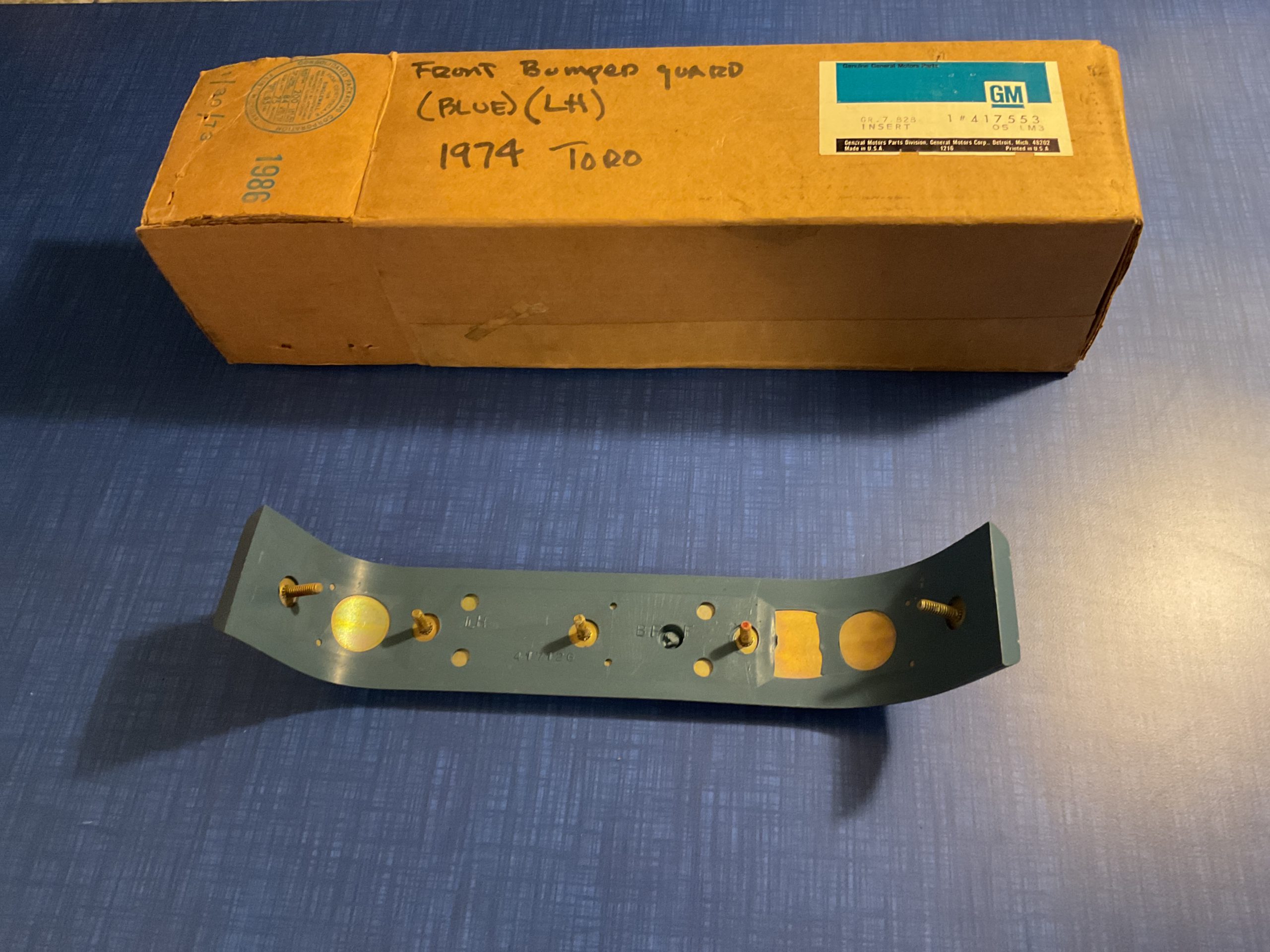 This new old stock Blue left hand front bumper guard insert was manufactured by General Motors for use on the following models: