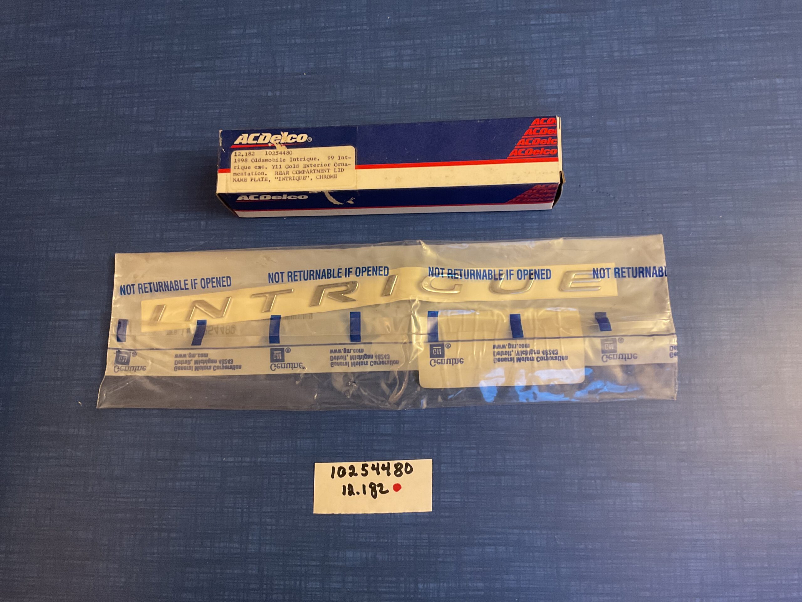 This new old stock rear compartment trunk lid license cover plate “Intrigue” name plate (Chrome) was manufactured by General Motors for use on the following models: