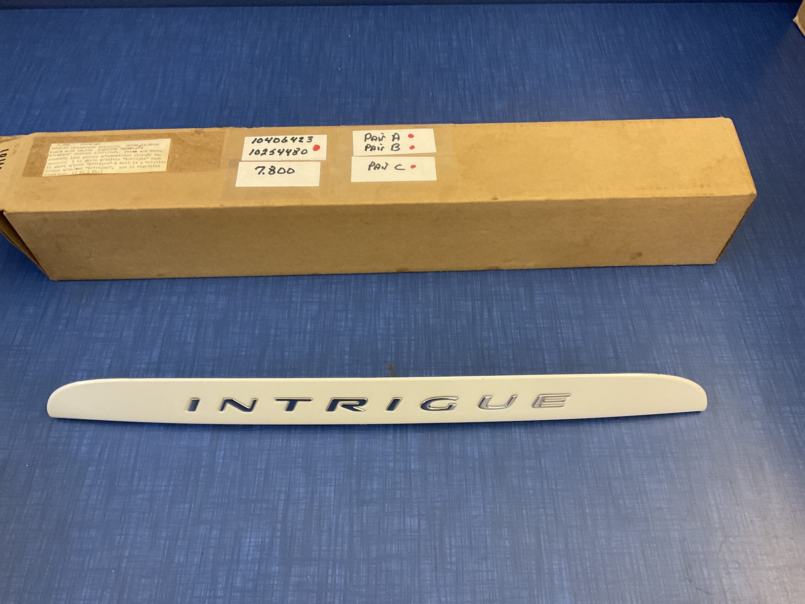 This new old stock rear compartment  trunk lid license cover plate with “Intrigue” name plate pair was manufactured by General Motors for use on the following models:
